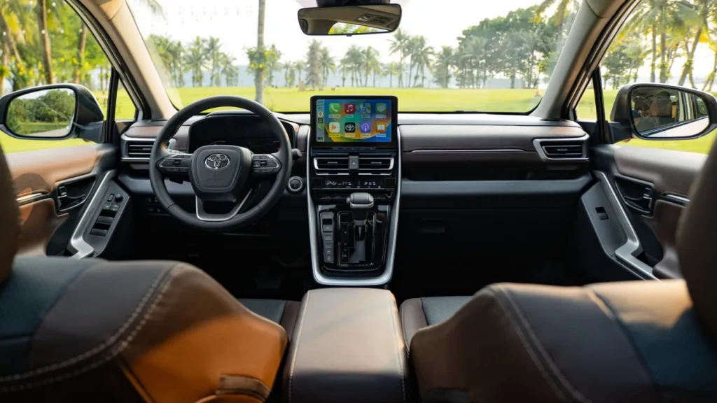 Hệ thống giải trí và tiện nghi trên phiên bản 2.0V được Toyota trang bị đầy đủ để chiều lòng những khách hàng khó tính nhất. Tại trung tâm là màn hình cảm ứng 10.1 inch đặt nổi, hỗ trợ kết nối Apple CarPlay và Android Auto không dây tiện lợi. Hệ thống điều hòa tự động một vùng với các cửa gió độc lập cho tất cả các hàng ghế đảm bảo khả năng làm lạnh nhanh và sâu tới từng vị trí ngồi. Một điểm cộng lớn về mặt tiện ích trên bản 2.0V chính là sự hiện diện của phanh tay điện tử và chế độ giữ phanh tự động (Auto Hold), cùng với hệ thống đèn trang trí nội thất màu xanh lam dịu nhẹ, tạo nên một không gian cabin hiện đại và thư thái vào ban đêm.