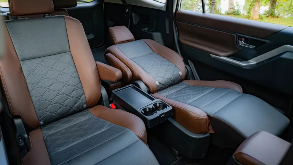 Toàn bộ hệ thống ghế ngồi trên Innova Cross 2.0V được bọc da cao cấp với tông màu nâu hạt dẻ phối đen vô cùng sang trọng và ấm cúng. Chất liệu da mềm mại, có độ đàn hồi tốt kết hợp với các đường chỉ khâu tỉ mỉ tạo nên một không gian tinh tế như những dòng xe hạng sang. Điểm khác biệt quan trọng của bản 2.0V (máy xăng) so với bản Hybrid chính là cấu hình 8 chỗ ngồi với hàng ghế thứ hai là dạng băng liền 3 vị trí. Thiết kế này mang lại sự linh hoạt tối đa cho các gia đình đông thành viên, cho phép chở nhiều người hơn mà vẫn đảm bảo khoảng để chân cực kỳ rộng rãi và độ ngả lưng ghế lớn, giúp hành khách luôn cảm thấy thoải mái trong những chuyến đi dài.