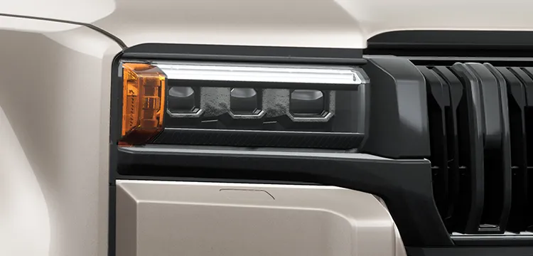 Cụm đèn trước của Toyota Land Cruiser Prado mới là sự kết hợp hoàn hảo giữa công nghệ chiếu sáng tân tiến và ngôn ngữ thiết kế giàu tính biểu tượng. Được chế tác với những đường nét sắc sảo, hệ thống đèn pha LED không chỉ đóng vai trò là “đôi mắt” tinh anh giúp chủ nhân quan sát rõ nét mọi chuyển động trong đêm tối, mà còn là điểm nhấn thẩm mỹ đầy mê hoặc. Điểm độc đáo của thế hệ mới chính là sự xuất hiện của các dải đèn định vị ban ngày tinh xảo, tạo nên một diện mạo hiện đại, giúp chiếc xe luôn nổi bật và đầy kiêu hãnh dù xuất hiện ở bất cứ nơi đâu.
